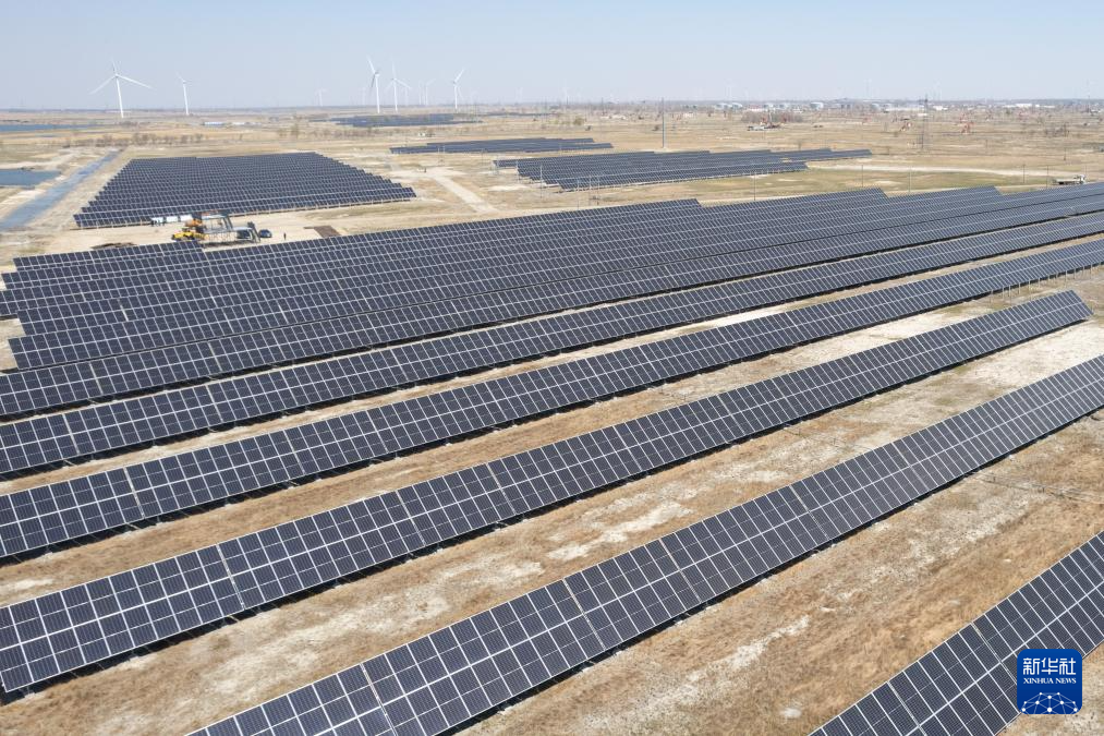 4月29日在大庆喇嘛甸油田低碳示范区拍摄的光伏基地和风电机组。