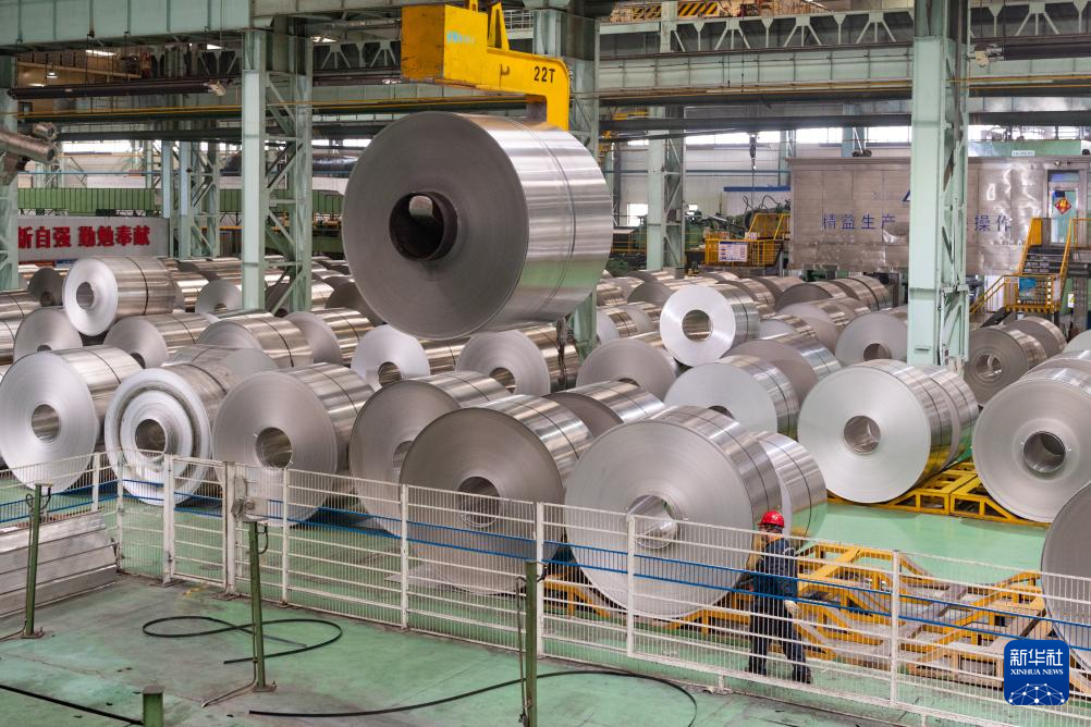 4月16日,在位于哈尔滨市的中铝集团东北轻合金有限责任公司生产厂区,工人操控吊机搬运铝卷。