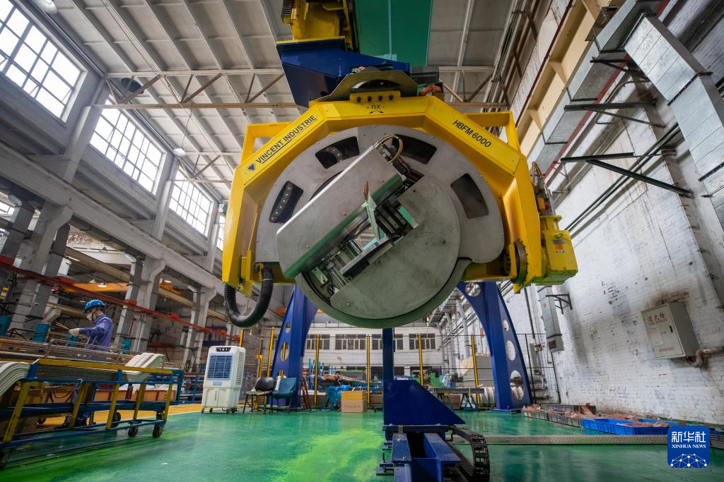 7月13日,在哈电集团哈尔滨电机厂有限责任公司生产车间,数控成型机在进行自动作业。