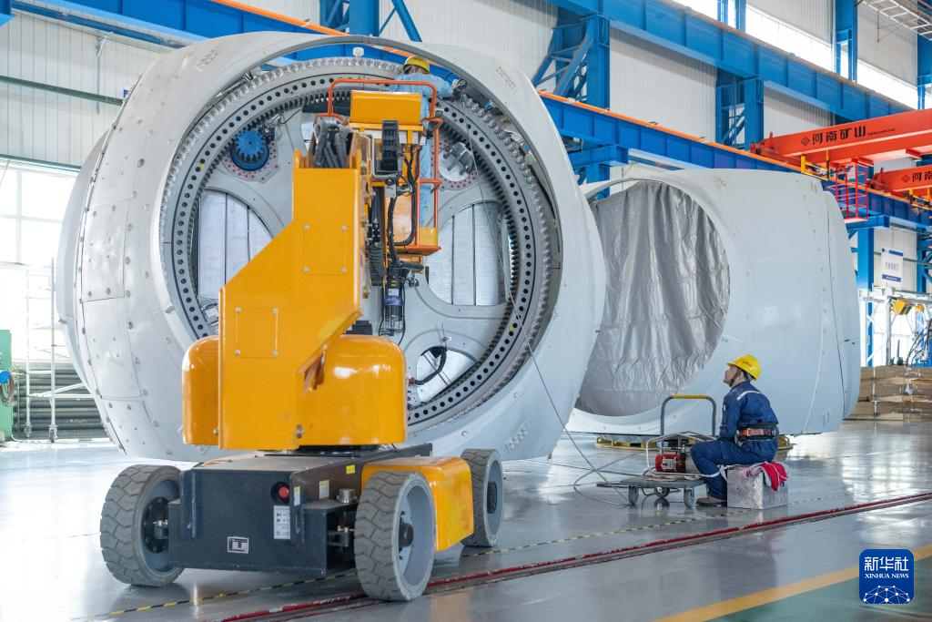 4月28日,工人在位于黑龙江省齐齐哈尔市的中国一重集团有限公司风电设备装配车间加工风电轮毂。