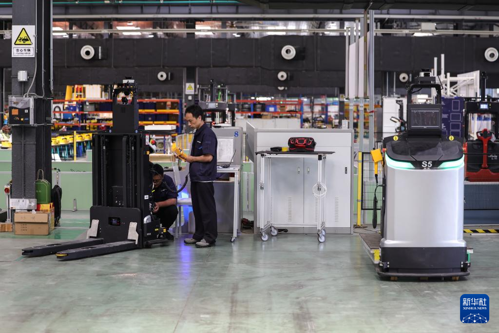 8月5日,在一汽解放动力总成事业部长春工厂集成AMT车间,工人对AGV搬运机器人进行动作测试。