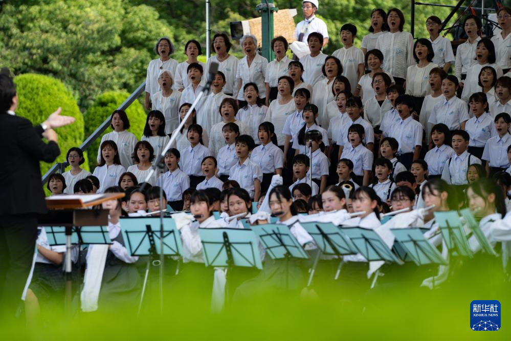 8月6日,在日本广岛举行的遭原子弹轰炸79周年纪念仪式上,合唱团唱歌纪念原子弹轰炸受害者。