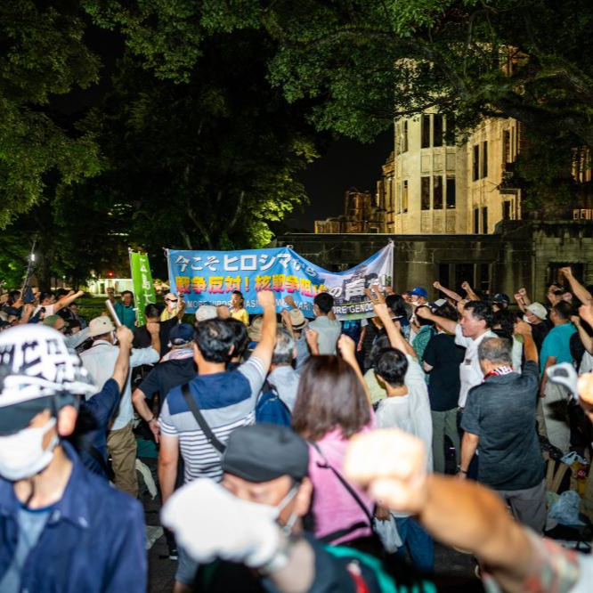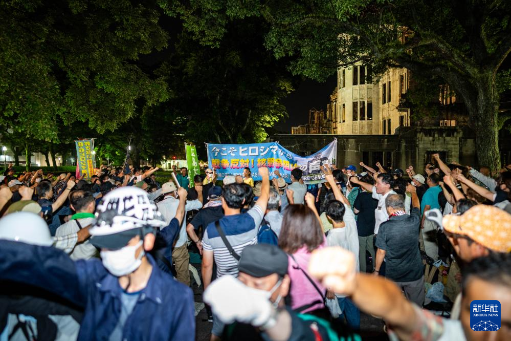 8月5日晚,民众在日本广岛和平纪念公园举行抗议集会。