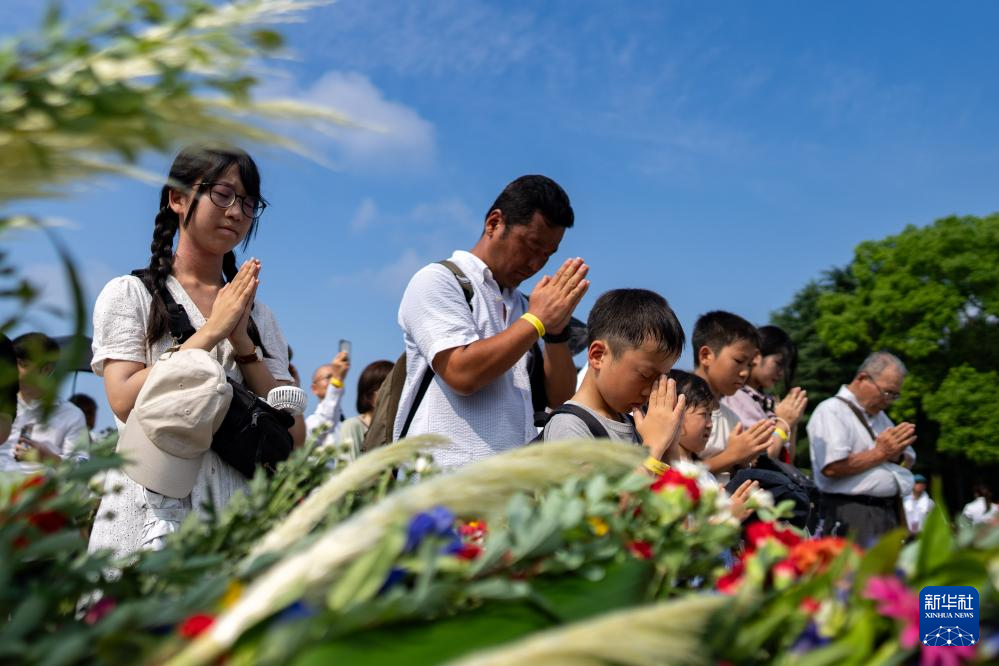 8月6日,在日本广岛举行的遭原子弹轰炸79周年纪念仪式后,人们排队献花,纪念原子弹轰炸受害者。