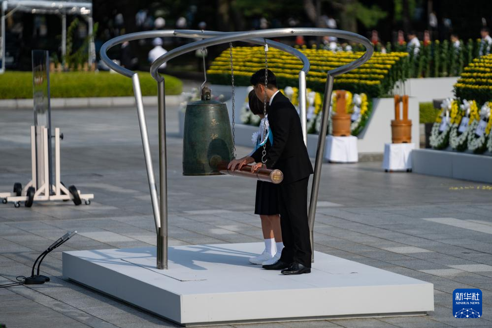 8月6日,在日本广岛举行的遭原子弹轰炸79周年纪念仪式上,参会者代表敲响和平之钟。