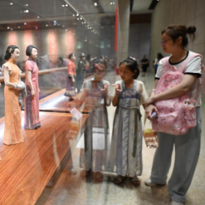 8月7日,中国工艺美术馆展厅举行的中华历代服饰泥塑展吸引游客驻足观看。