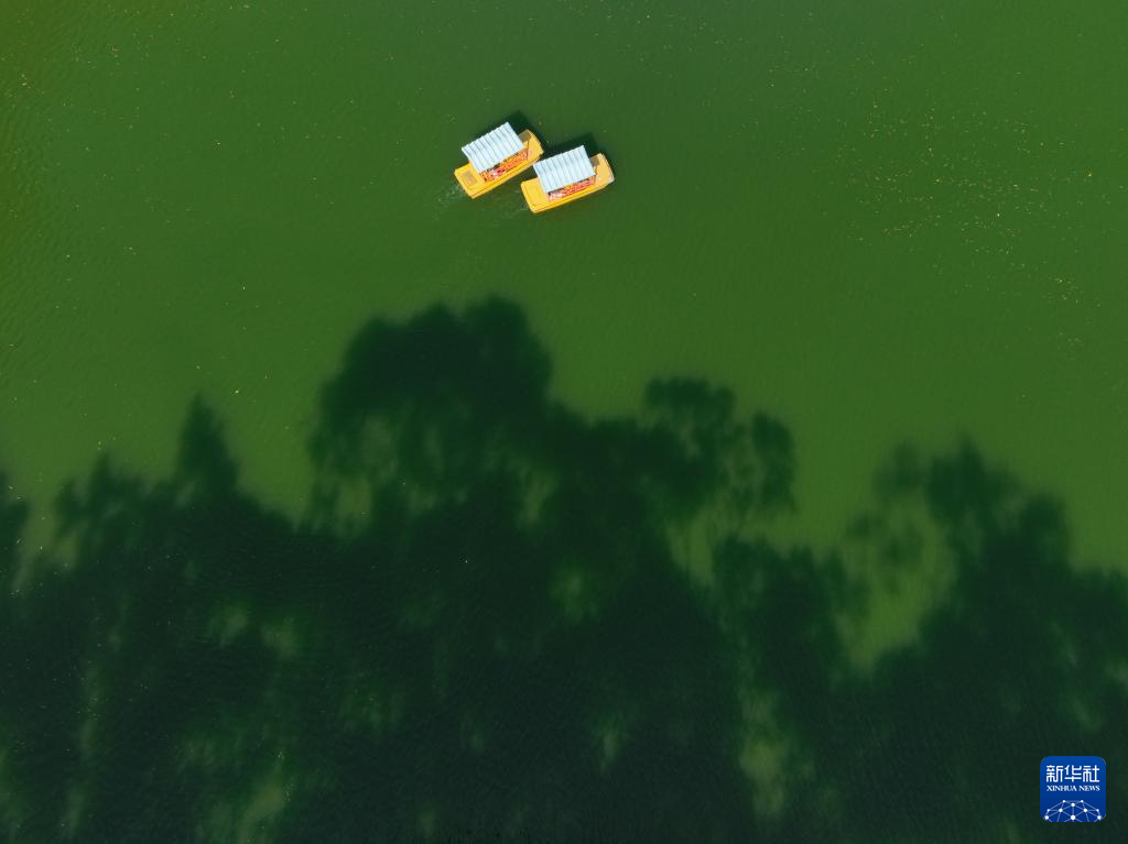 8月7日,两艘游船在福州西湖上行驶(无人机照片)。
