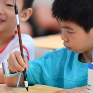 8月7日,在长沙市望城区月亮岛街道黄都港社区,小朋友在书法课上练习写字。