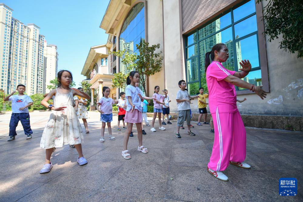 8月7日,在长沙市望城区月亮岛街道黄都港社区,小朋友跟着志愿者练习太极拳。