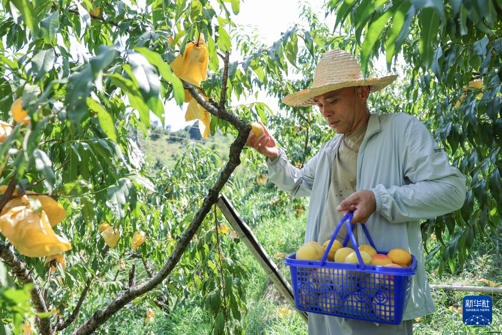 8月7日,种植户在璜山镇黄家店村的桃林里采摘黄桃。