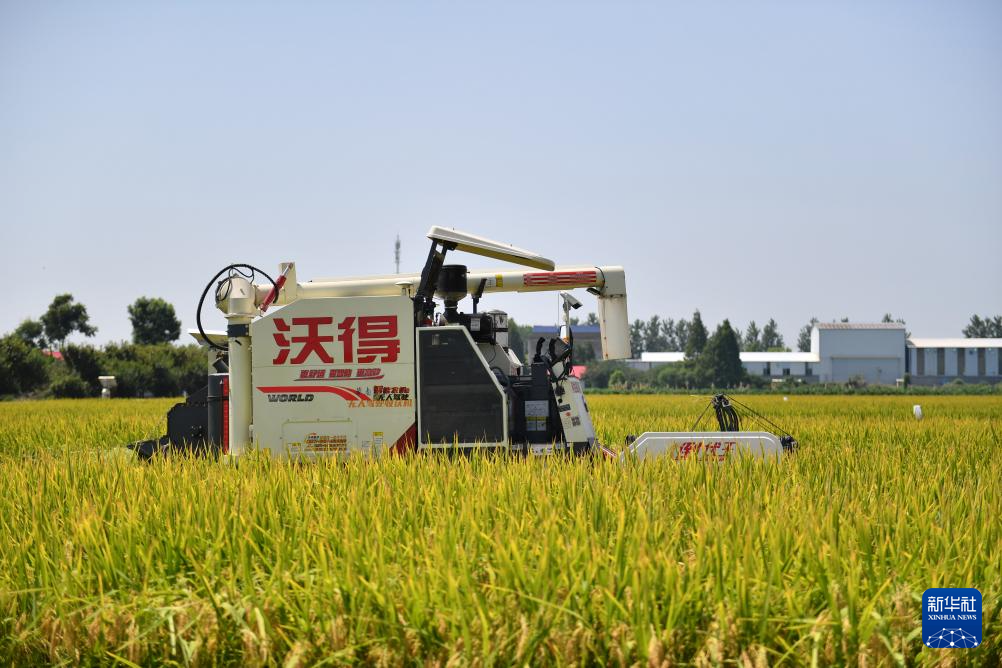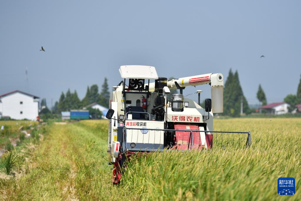 8月7日,一台无人驾驶收割机在测产现场收割再生稻。