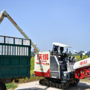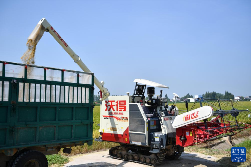 8月7日,一台无人驾驶收割机在测产现场装卸稻谷。