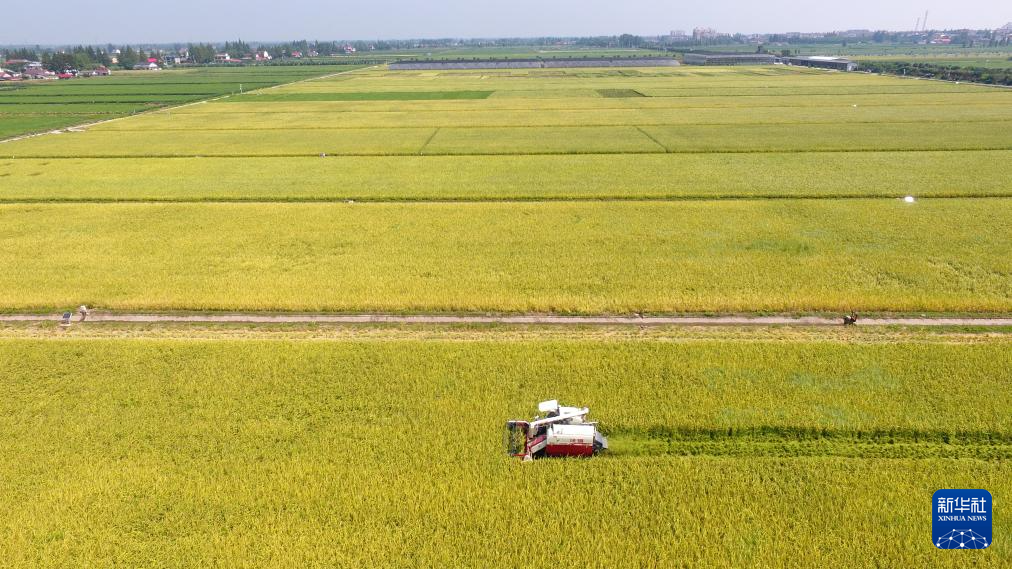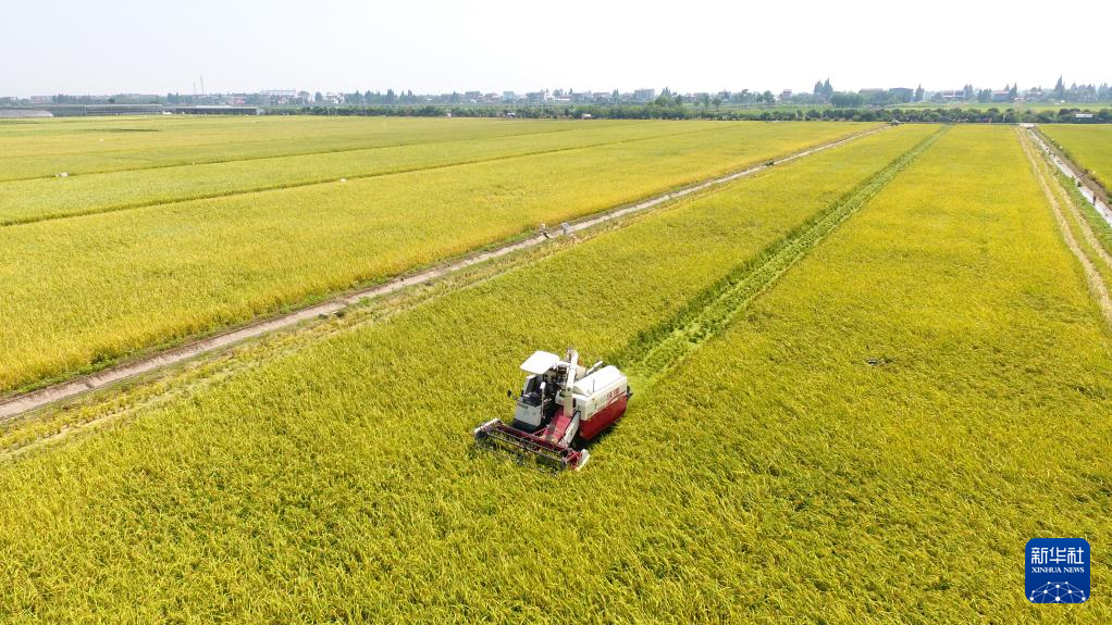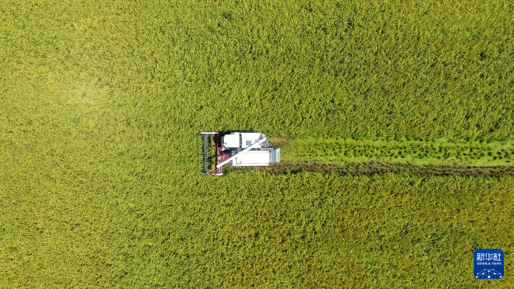 8月7日,一台无人驾驶收割机在测产现场收割再生稻(无人机照片)。