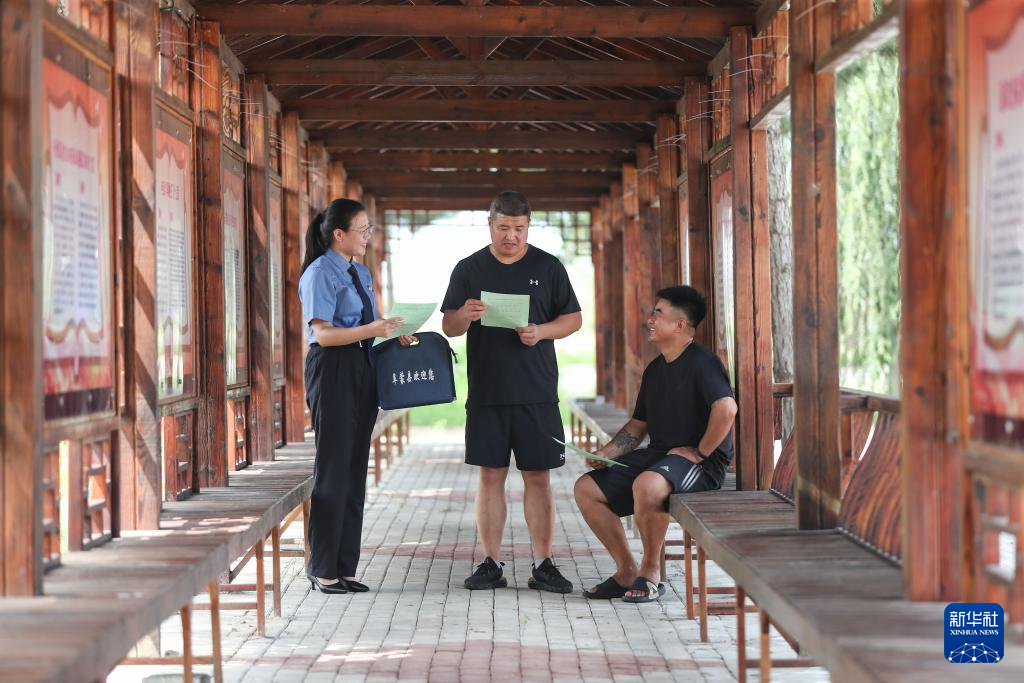 8月7日,辽宁阜新蒙古族自治县人民检察院检察人员在于寺镇官营子村向村民发放普法宣传材料。