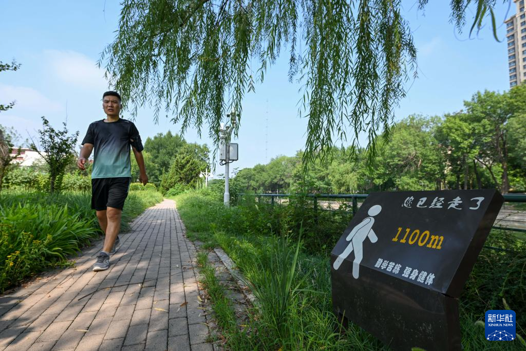 8月8日,市民在天津市城市绿道公园的步道上慢走。