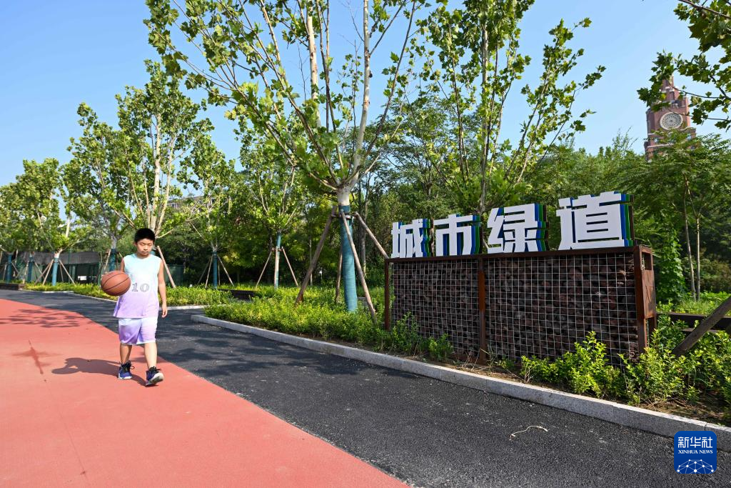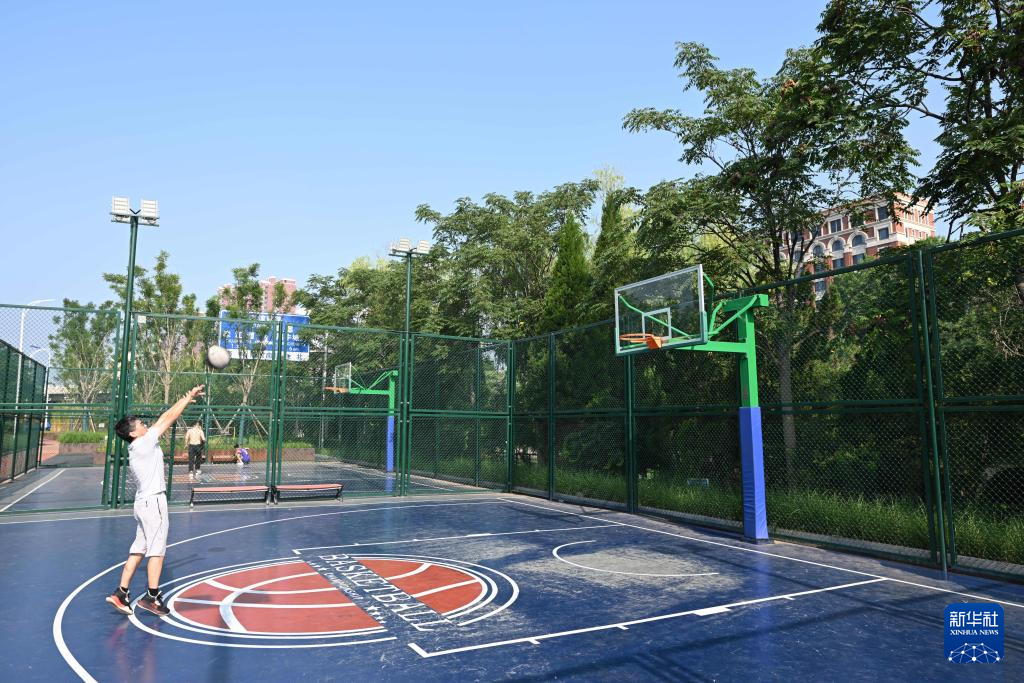 8月8日,市民在天津市城市绿道公园打篮球。