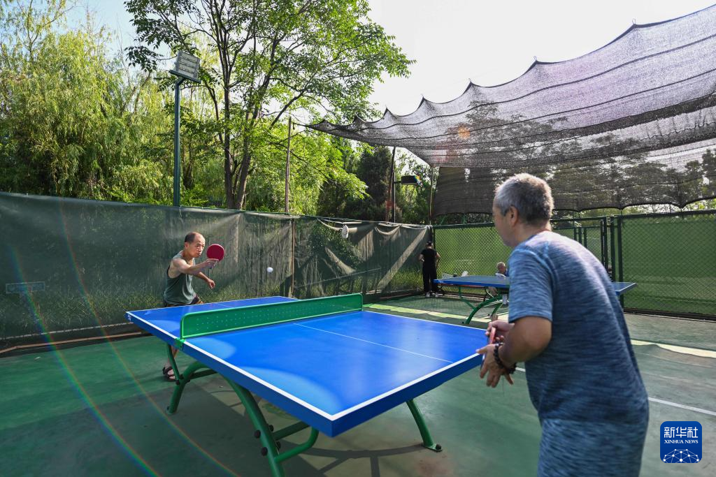 8月8日,市民在天津市城市绿道公园打乒乓球。