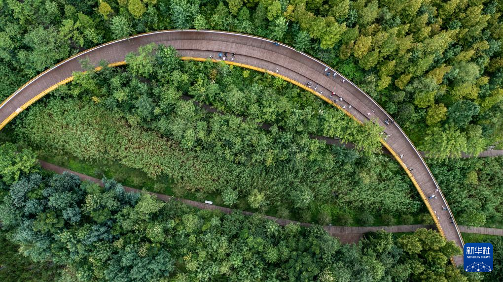 游客在贵州六盘水明湖国家湿地公园观光游玩(8月7日摄,无人机照片)。