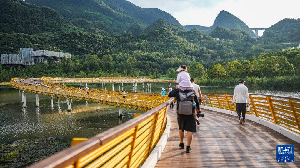 游客在贵州六盘水明湖国家湿地公园观光游玩(8月7日摄)。