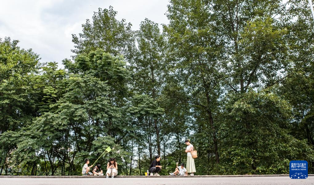 游客在贵州六盘水明湖国家湿地公园休憩(8月7日摄)。