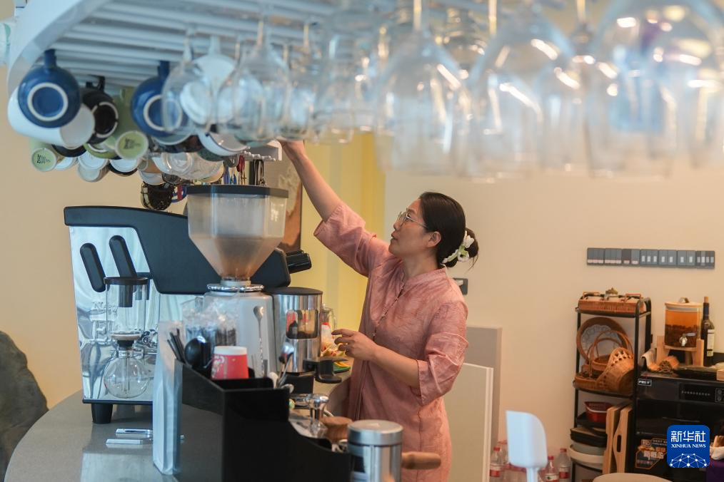 8月5日,在神农架林区木鱼镇,民宿经营者万玉莲在自家民宿内忙碌。有着多年旅游行业从业经验的万玉莲对自己想要什么非常明确,她在民宿里打造了咖啡吧台、儿童娱乐等公共空间,目前还有一个餐厅在建。