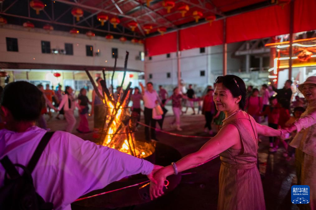 8月6日,在神农架林区木鱼镇,游客在篝火晚会上跳摆手舞。