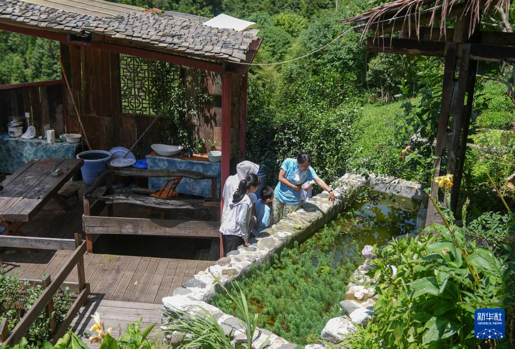 8月6日,在神农架林区红花坪村,民宿经营者韦群带小朋友们参观民宿。韦群是土生土长的神农架人。2020年,她在红花坪村盘下了一栋夯土房,经过一年时间,将其打造成了一座具有9间客房,配备餐厅、茶室、书屋以及制茶屋、熏肉房和扎染作坊的别具文化特色的民宿。