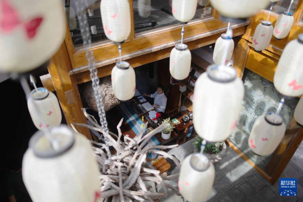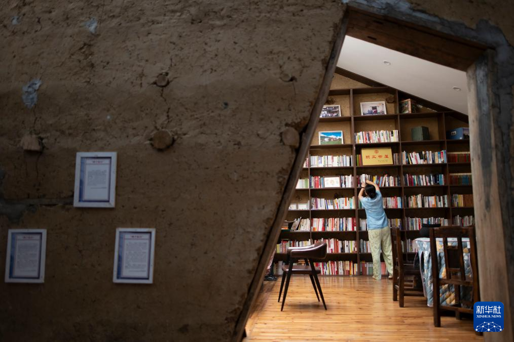 8月6日,在神农架林区红花坪村,民宿经营者韦群整理民宿内的书架。韦群是土生土长的神农架人。2020年,她在红花坪村盘下了一栋夯土房,经过一年时间,将其打造成了一座具有9间客房,配备餐厅、茶室、书屋以及制茶屋、熏肉房和扎染作坊的别具文化特色的民宿。