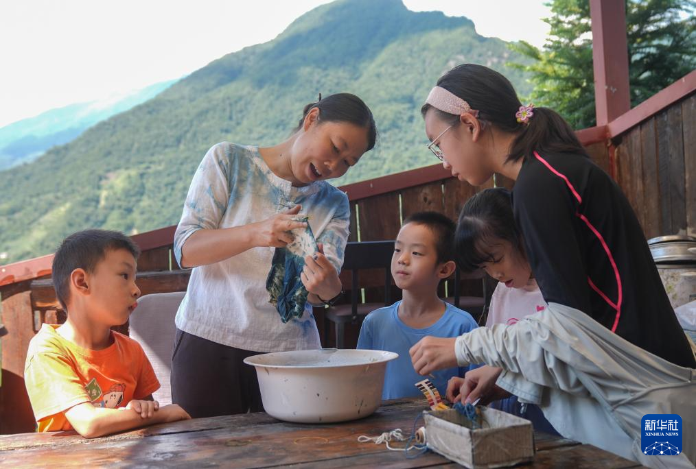 8月7日,在神农架林区红花坪村,民宿经营者韦群在民宿内带小朋友们体验扎染。韦群是土生土长的神农架人。2020年,她在红花坪村盘下了一栋夯土房,经过一年时间,将其打造成了一座具有9间客房,配备餐厅、茶室、书屋以及制茶屋、熏肉房和扎染作坊的别具文化特色的民宿。