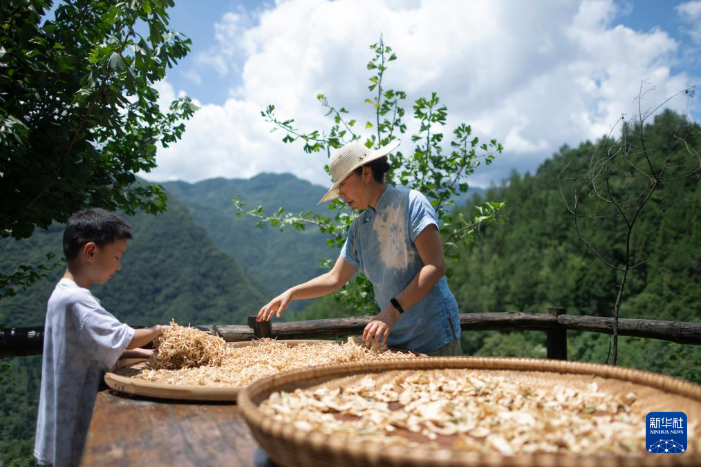 8月6日,在神农架林区红花坪村,民宿经营者韦群向一名小朋友介绍晾晒的萝卜干。韦群是土生土长的神农架人。2020年,她在红花坪村盘下了一栋夯土房,经过一年时间,将其打造成了一座具有9间客房,配备餐厅、茶室、书屋以及制茶屋、熏肉房和扎染作坊的别具文化特色的民宿。