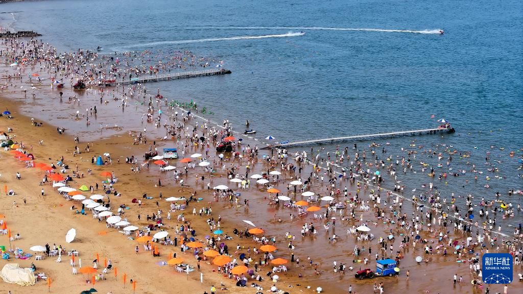 8月8日,在日照市万平口沙滩,游客在休闲消夏(无人机照片)。