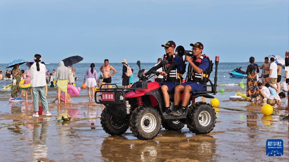 8月8日,在日照市万平口沙滩,日照市消防救援支队阳光海岸站的指战员巡护并提醒游客注意安全。