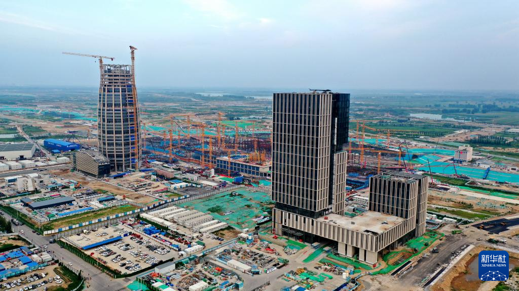 这是位于雄安新区启动区内的中国中化总部大楼(右)和中国华能总部大楼建设现场(8月8日摄,无人机照片)。目前大楼均已封顶,正在开展装饰装修。