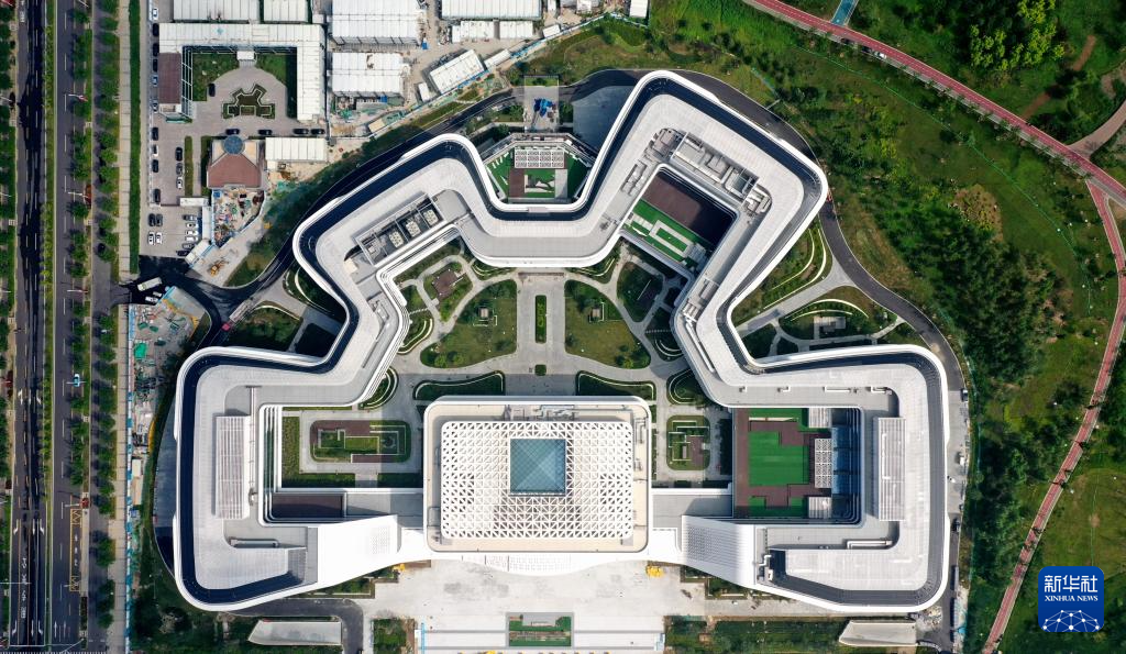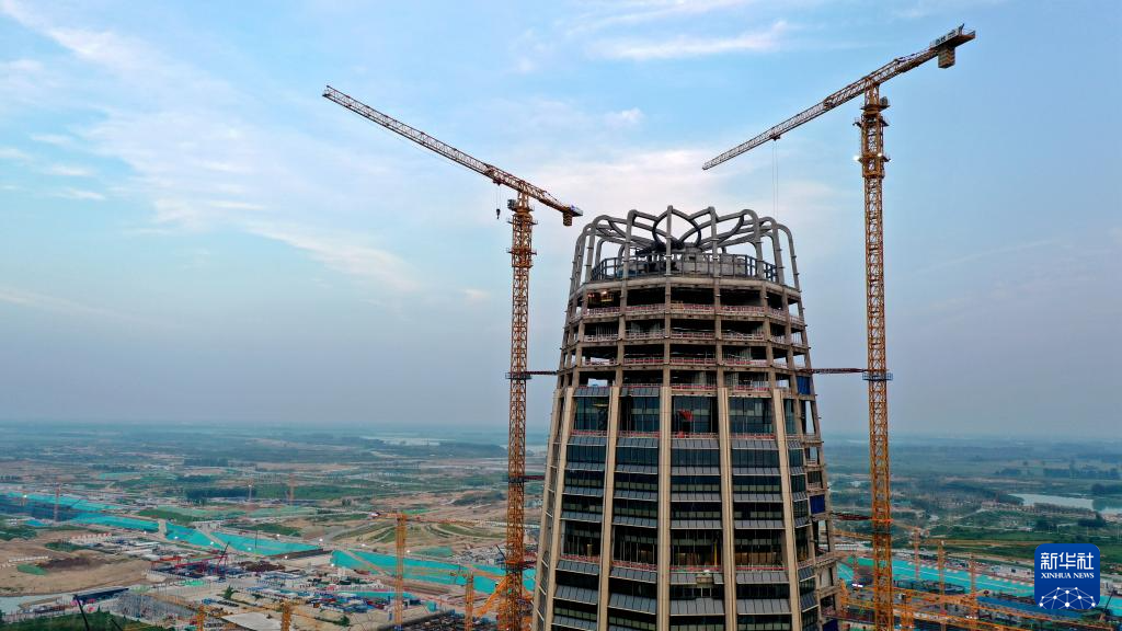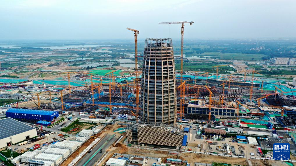 这是位于雄安新区启动区内的中国中化总部大楼建设现场(8月8日摄,无人机照片)。目前大楼已封顶,正在开展装饰装修。
