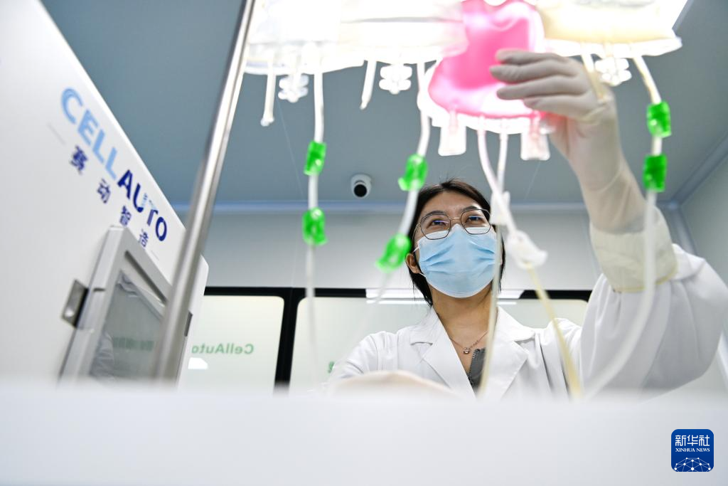 在位于哈尔滨新区的哈尔滨北科健康科技有限公司细胞制剂数字化智能化生产线,细胞制备工程师在工作(8月9日摄)。