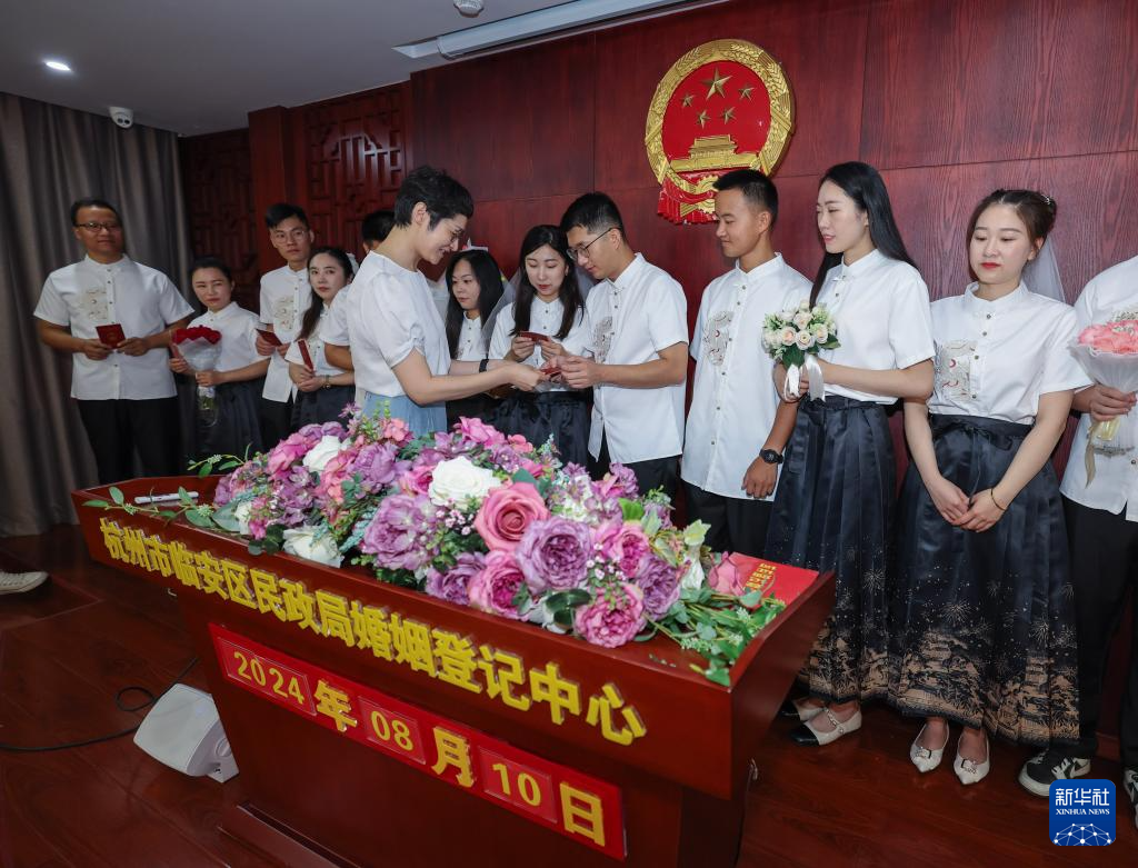 当日是中国传统节日“七夕节”,浙江省杭州市临安区民政局婚姻登记中心迎来100多对新人预约登记。临安区民政局婚姻登记中心在做好结婚登记服务保障工作的同时,还举办“陌上花开·邂逅七夕”主题活动,通过举行集体颁证仪式、开设婚姻家庭课堂以及打卡文旅景区等“婚登+文旅”新模式,推进文明向上、简约适度的婚俗文化。