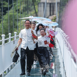 8月10日,新人们在临安太湖源景区的玻璃桥参加主题活动(无人机照片)。
