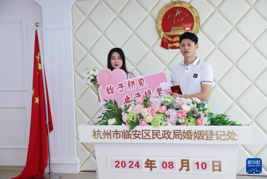 8月10日,新人在杭州市临安区民政局婚姻登记中心拍照留念。