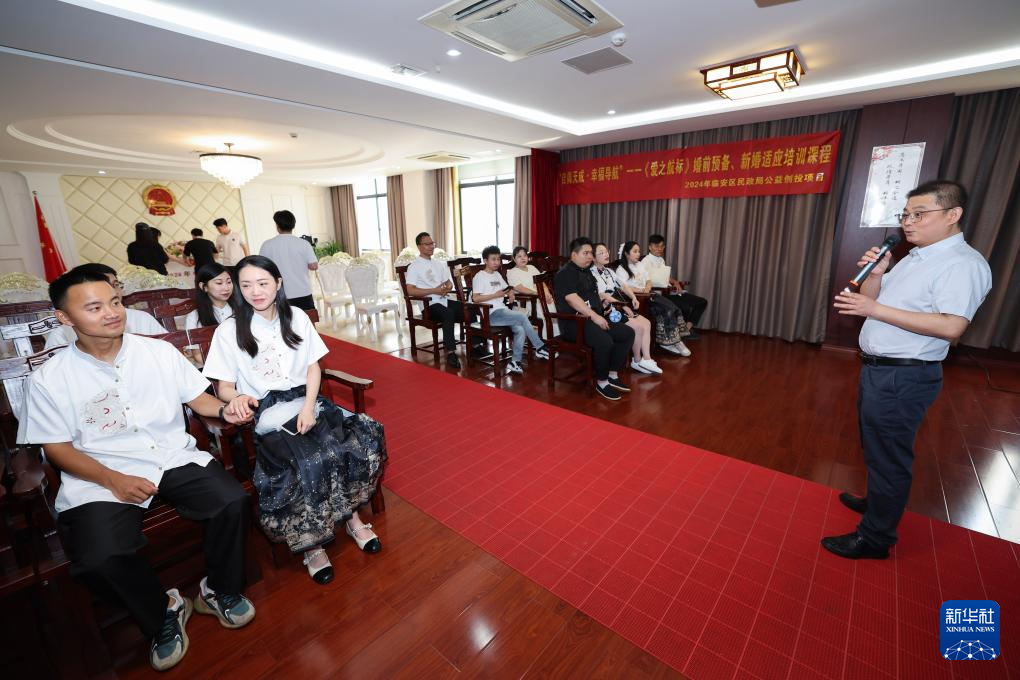 8月10日,在杭州市临安区民政局婚姻登记中心,工作人员给新人们上婚姻家庭课堂。