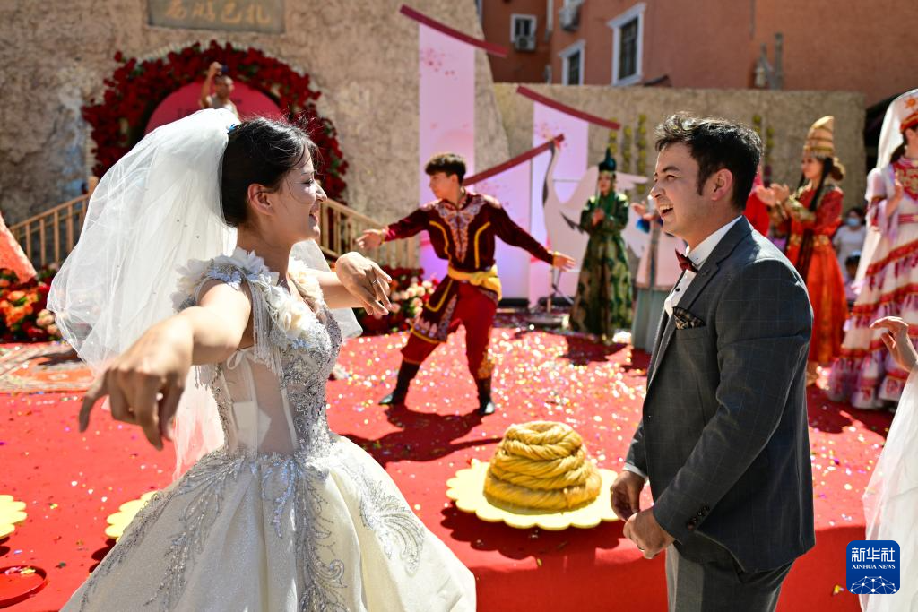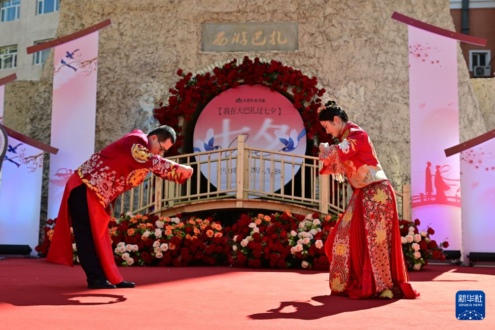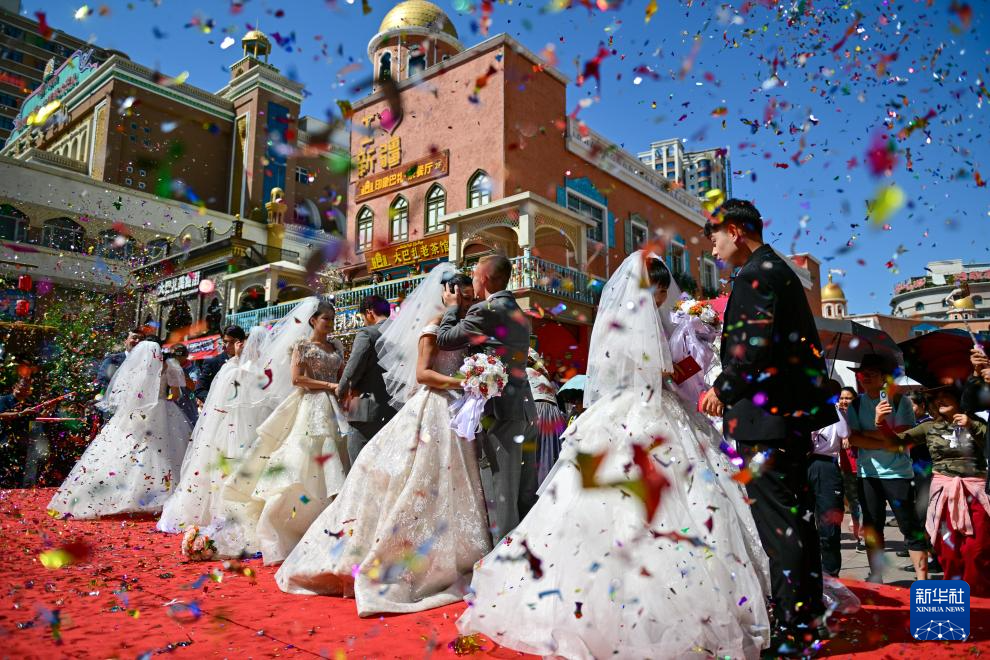 当日是七夕佳节,来自新疆乌鲁木齐市天山区的10对新人在新疆国际大巴扎街区举办集体婚礼,浪漫、欢乐且充满文化韵味的节日氛围吸引众多市民和游客。