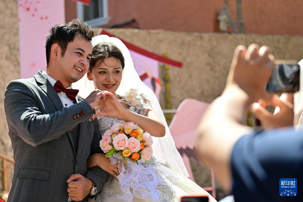 8月10日,一对新人在新疆国际大巴扎街区举行的集体婚礼上拍照留念。