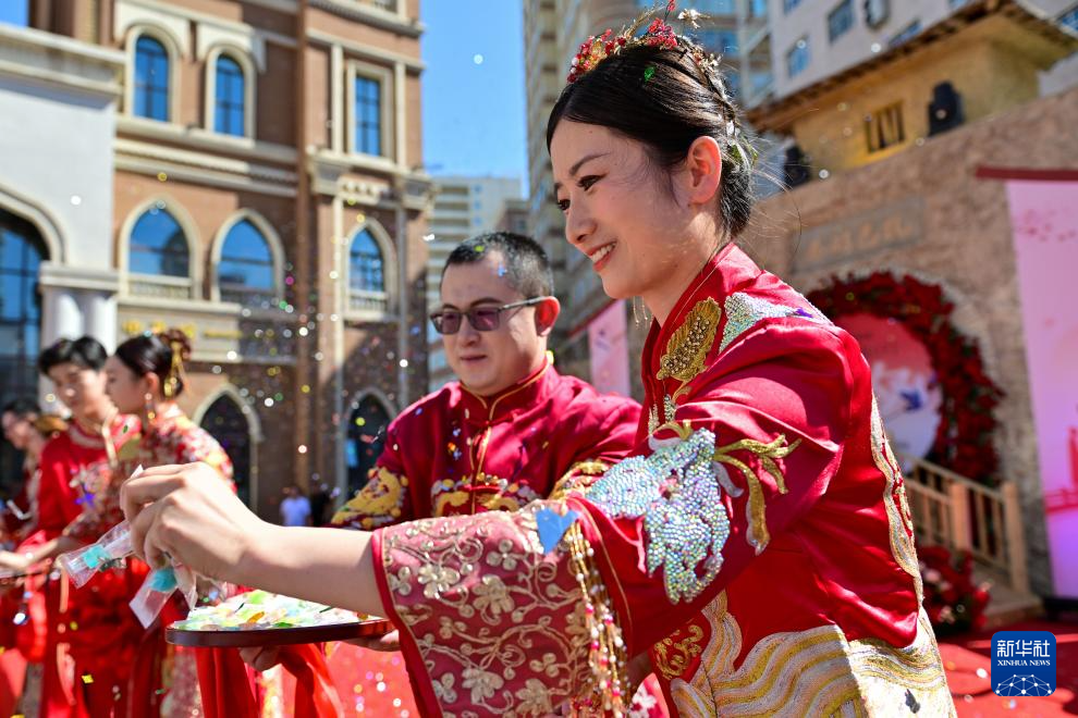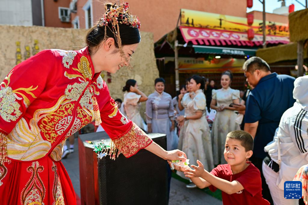 8月10日,在新疆国际大巴扎街区,新人在婚礼仪式上分发喜糖。
