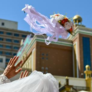 8月10日,在新疆国际大巴扎街区,参加婚礼的新人抛捧花。