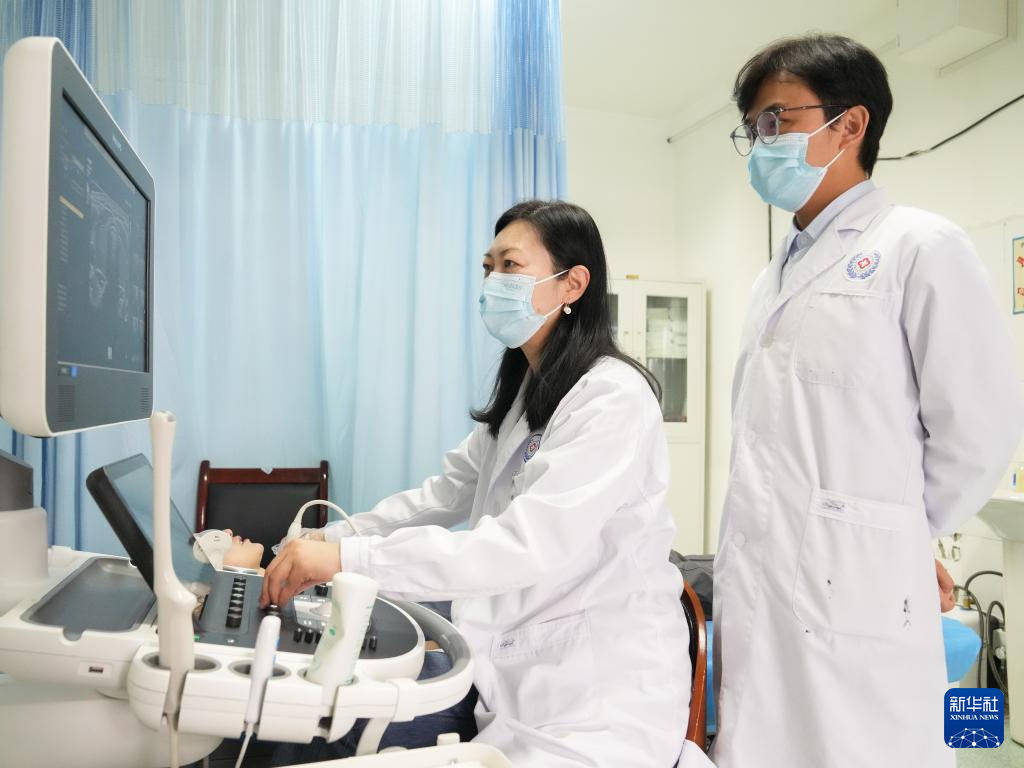 在西藏自治区人民医院,徐钟慧(左)与徒弟宋彬彬在为患者进行超声检查(7月12日摄)。