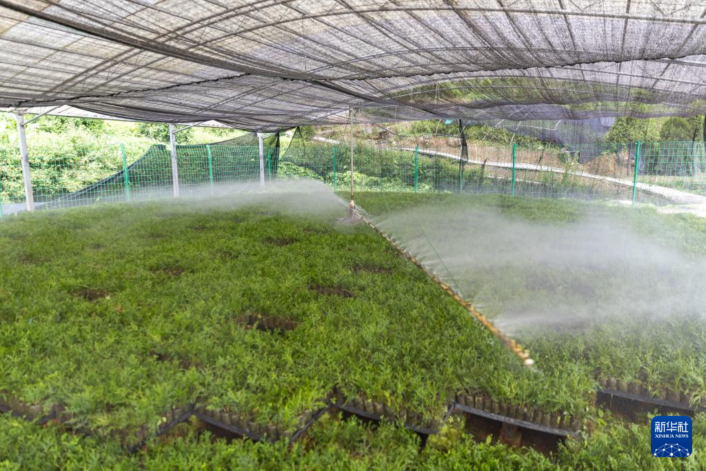 8月7日,在位于重庆市开州区温泉镇乐园村的重庆雪宝山国家级自然保护区崖柏繁育科研基地,自动喷淋装置定时为崖柏幼苗浇水。