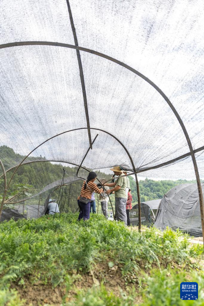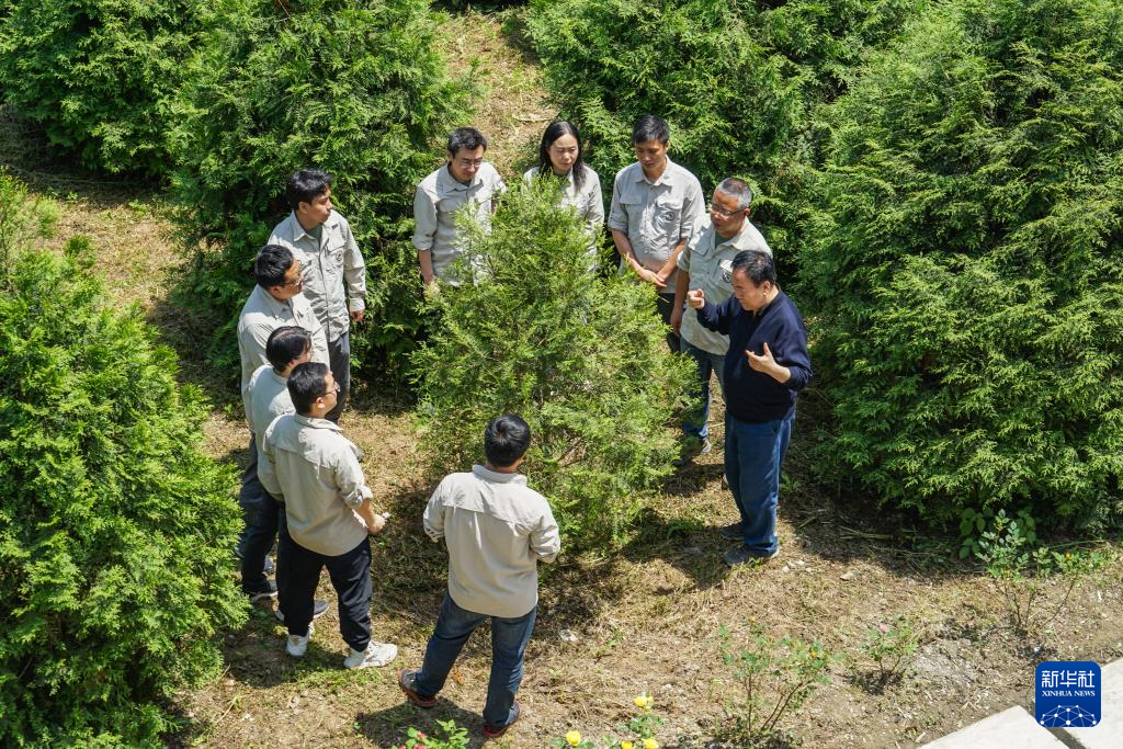 4月26日,在位于重庆市开州区温泉镇乐园村的重庆雪宝山国家级自然保护区崖柏繁育科研基地,工作人员与中国林业科学院专家郭泉水(右一)讨论崖柏的繁育技术。