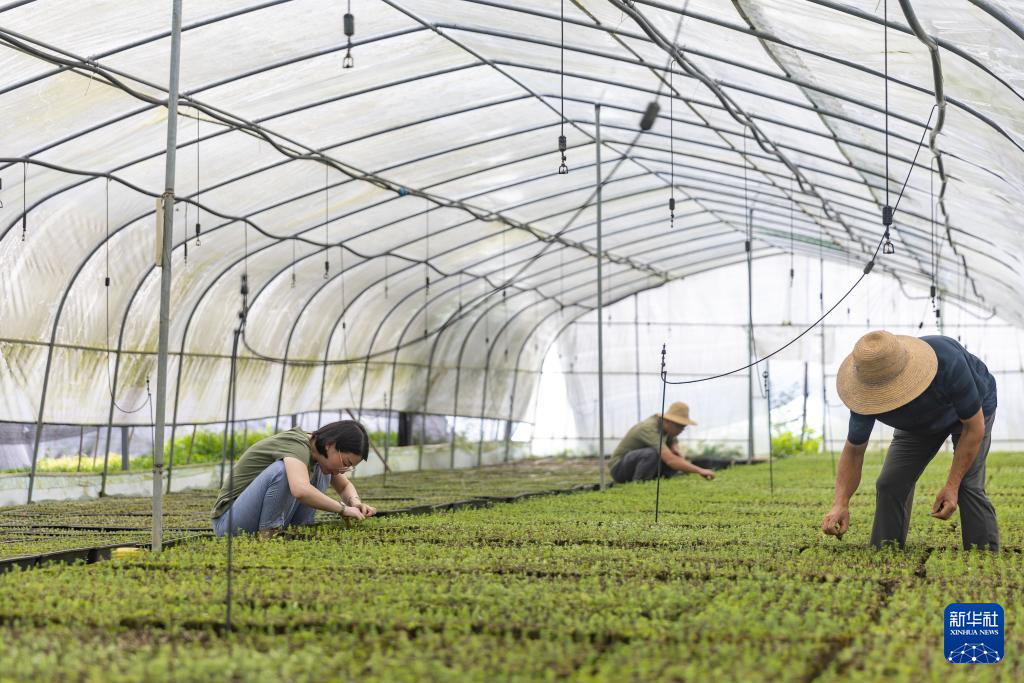 8月7日,在位于重庆市开州区温泉镇乐园村的重庆雪宝山国家级自然保护区崖柏繁育科研基地,工作人员为新繁育的崖柏幼苗除草。