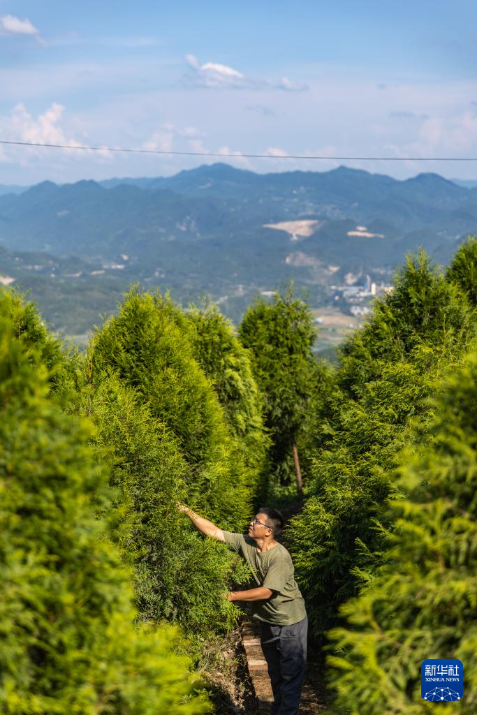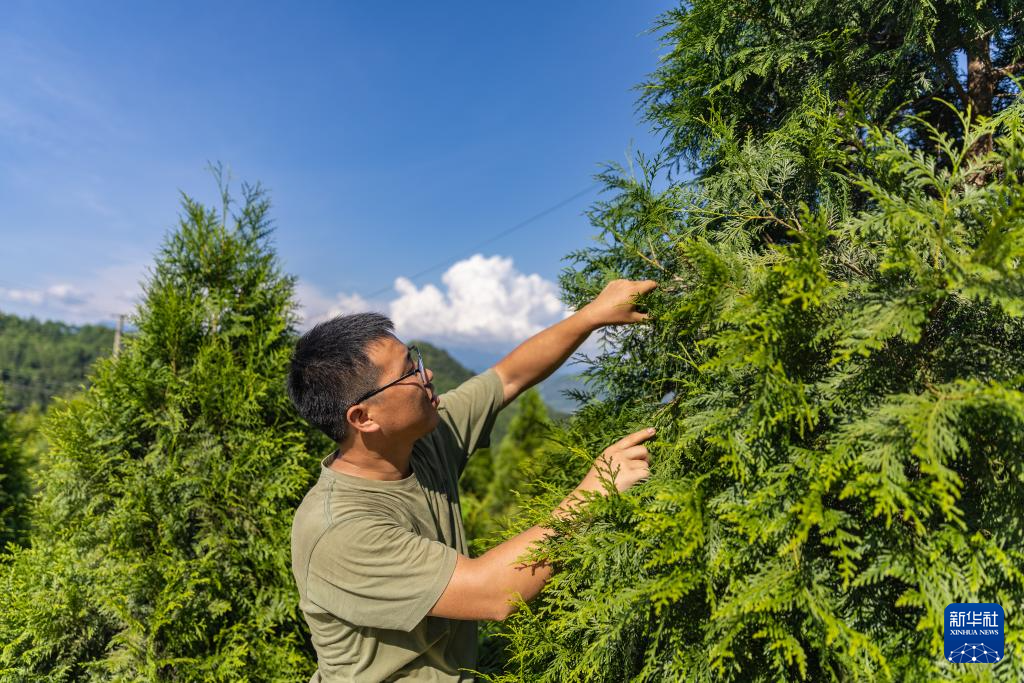 8月7日,在位于重庆市开州区温泉镇乐园村的重庆雪宝山国家级自然保护区崖柏繁育科研基地,工作人员在监测崖柏树苗生长情况。