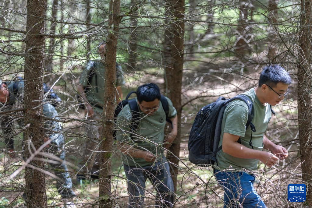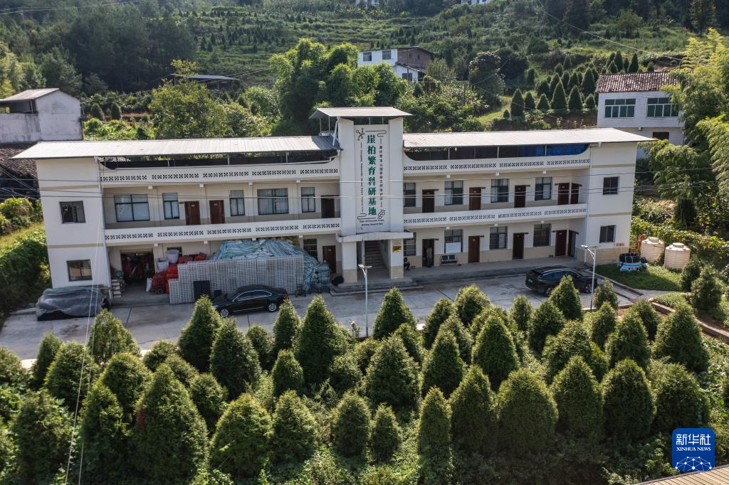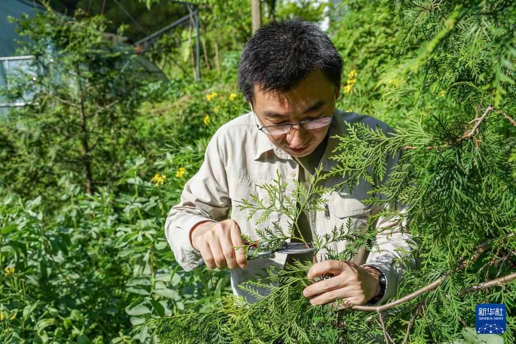 8月7日,在位于重庆市开州区温泉镇乐园村的重庆雪宝山国家级自然保护区崖柏繁育科研基地,科研人员在回归区查看崖柏结种情况。
