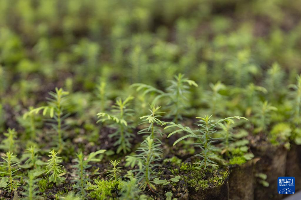 这是8月7日在位于重庆市开州区温泉镇乐园村的重庆雪宝山国家级自然保护区崖柏繁育科研基地拍摄的崖柏幼苗。